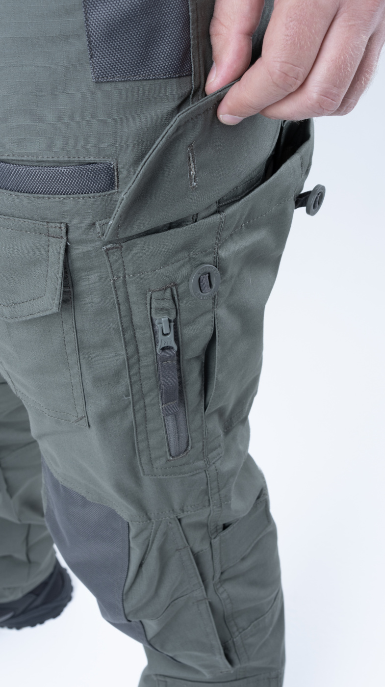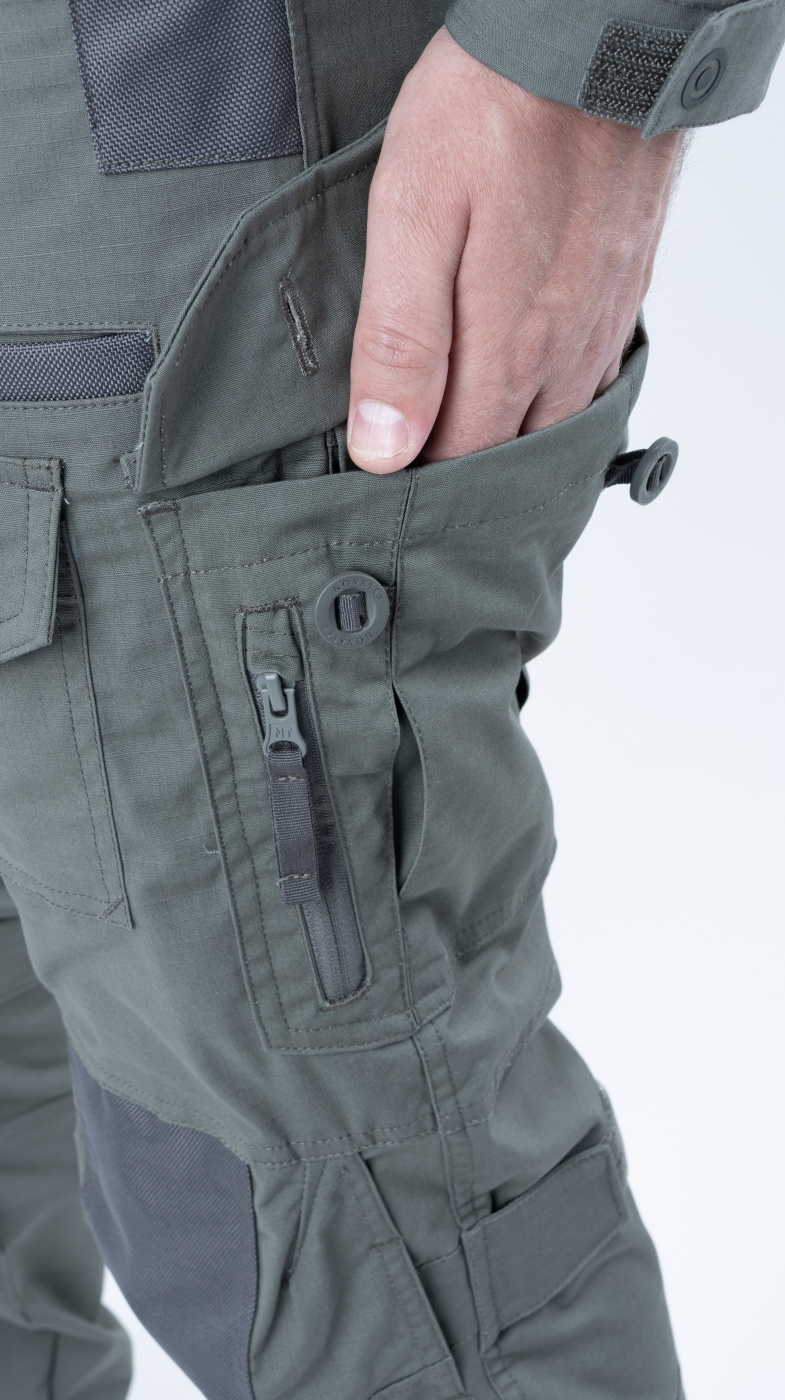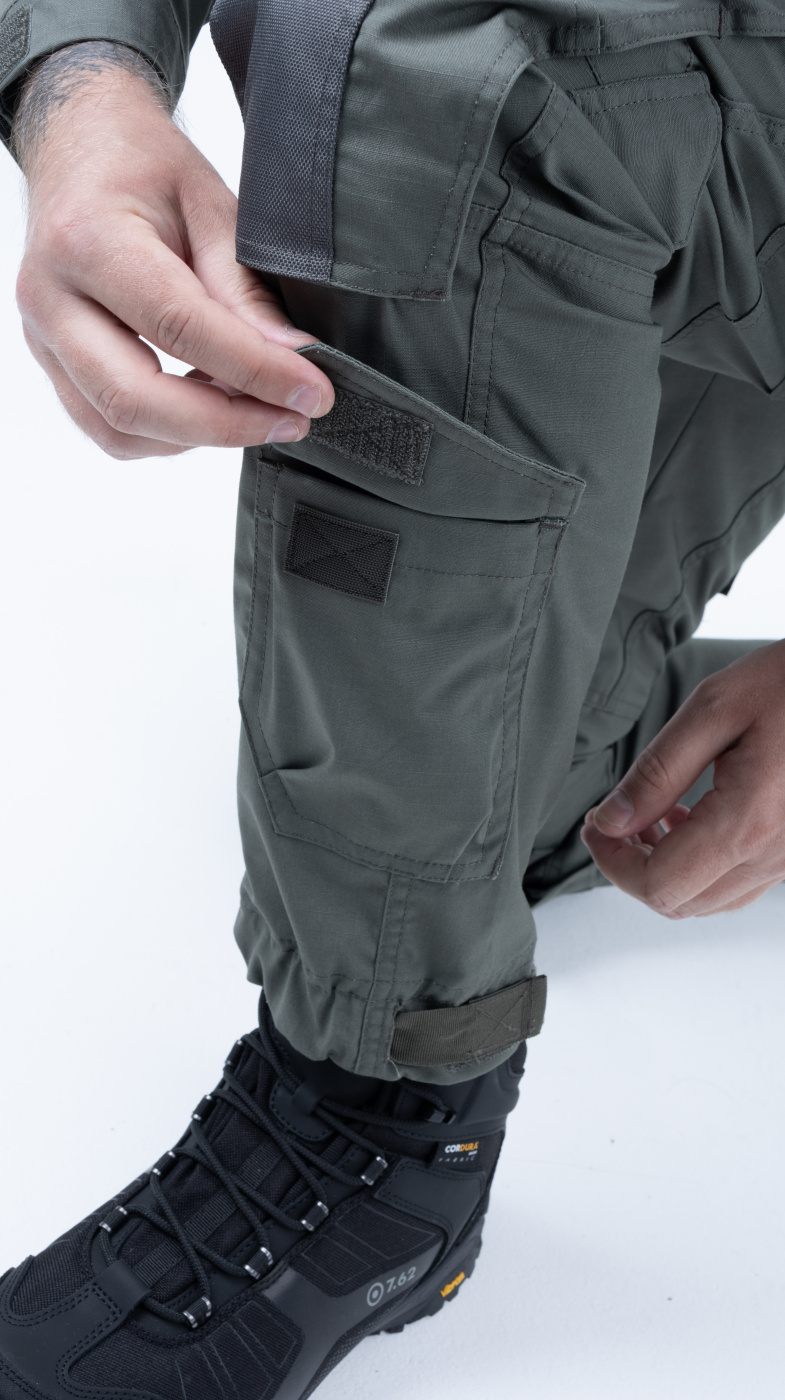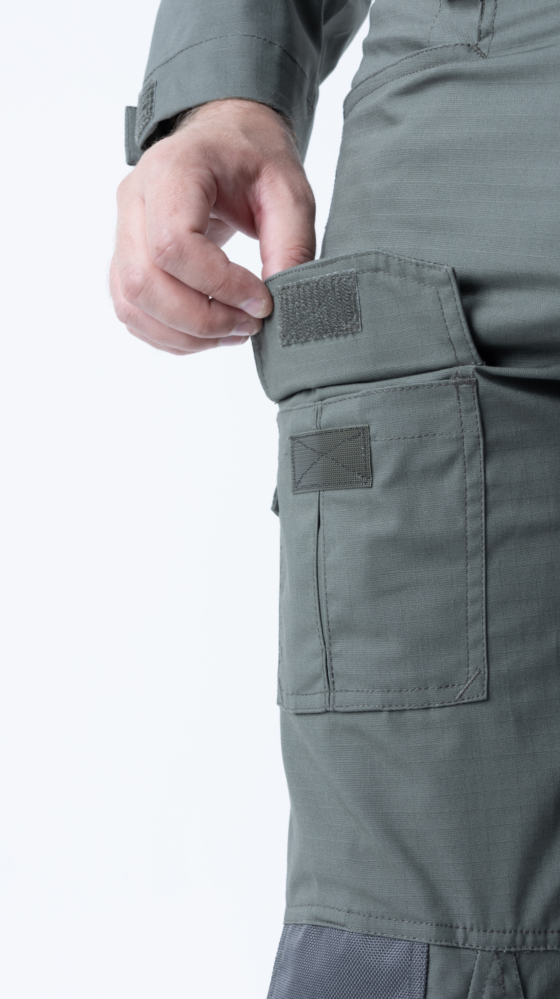 Удобный анатомический крой. Брюки застегиваются на молнию и пуговицу. Пояс широкий, резинка для комфортной посадки. 6 шлевок, подойдут под широкий ремень до 6 см. 8 вместительных карманов: 2 боковых прорезных, по 2 на бедрах, в области коленей и сзади — на пуговицах. Низ брюк на резинке.