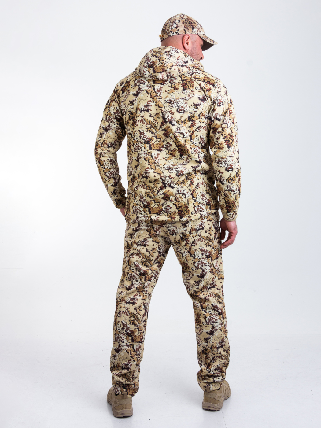 Костюм изготовлен из двухстороннего трикотажного полотна плотностью 280 г/м². С одной стороны он представляет собой гладкий трикотаж, а с другой — мягкий флис. Это сочетание обеспечивает комфорт и тепло, позволяя носить костюм в самых различных условиях.