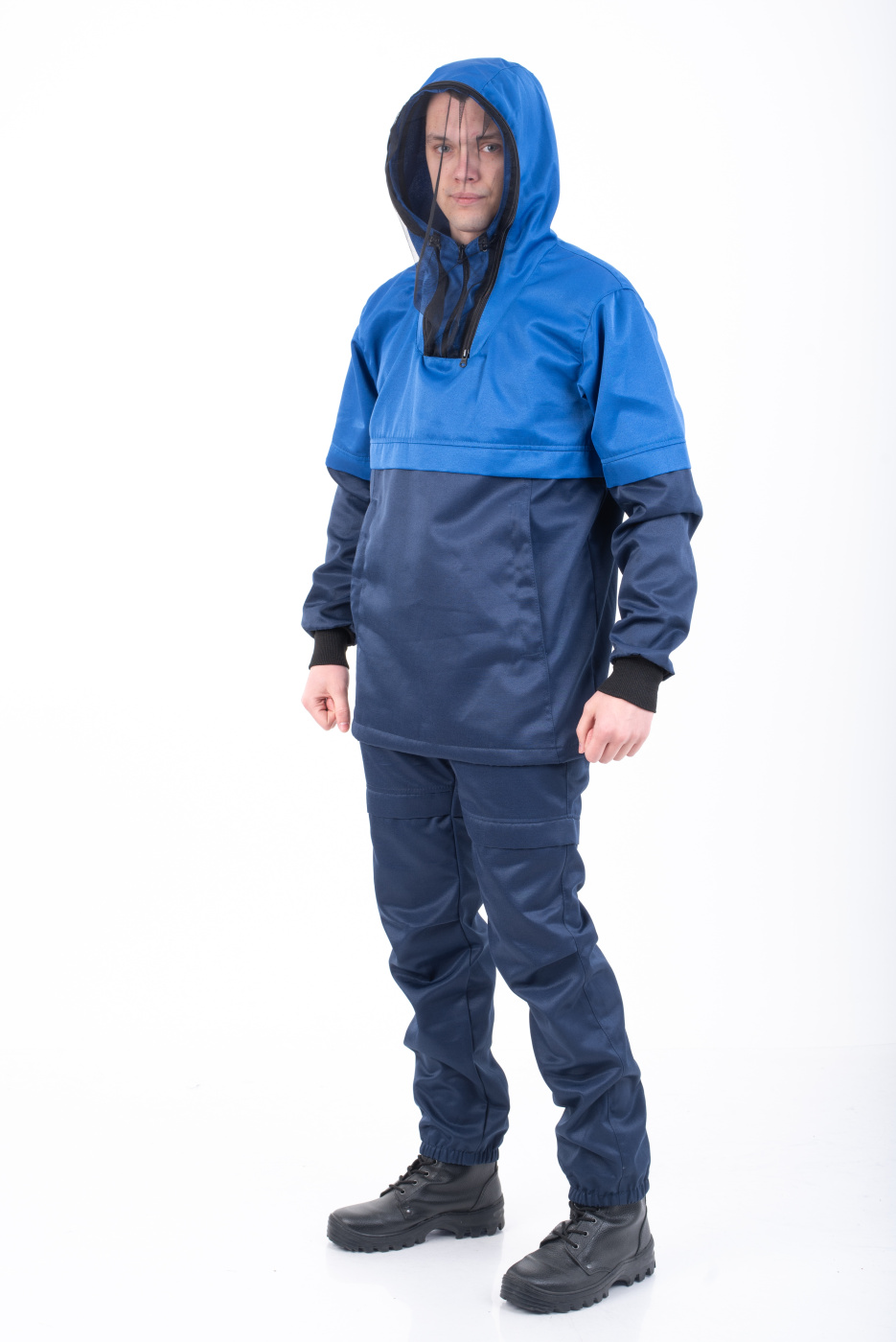 Костюм оснащен специальными ловушками для клещей – на рукавах, куртке, брюках. Сетка накомарника съемная и легко убирается в потайной карман на груди. Куртка утягивается по низу.Рукава оснащены плотными трикотажными манжетами. В куртке один большой карман-кенгуру с листочками на липучках.