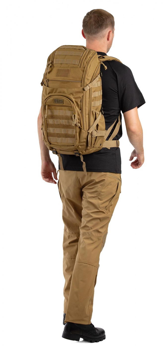 Рюкзак оснащен системой Molle/PALS для крепления подсумков, а также совместим с питьевой системой. Боковые утяжки с фастексами обеспечивают регулировку объема. Рюкзак оснащен эргономичной спинкой с широкими s- образными плечевыми лямками и поясным не съемным ремнем. Имеет основное объемное отделение, открывающееся на 180С, с органайзером на передней стенке.